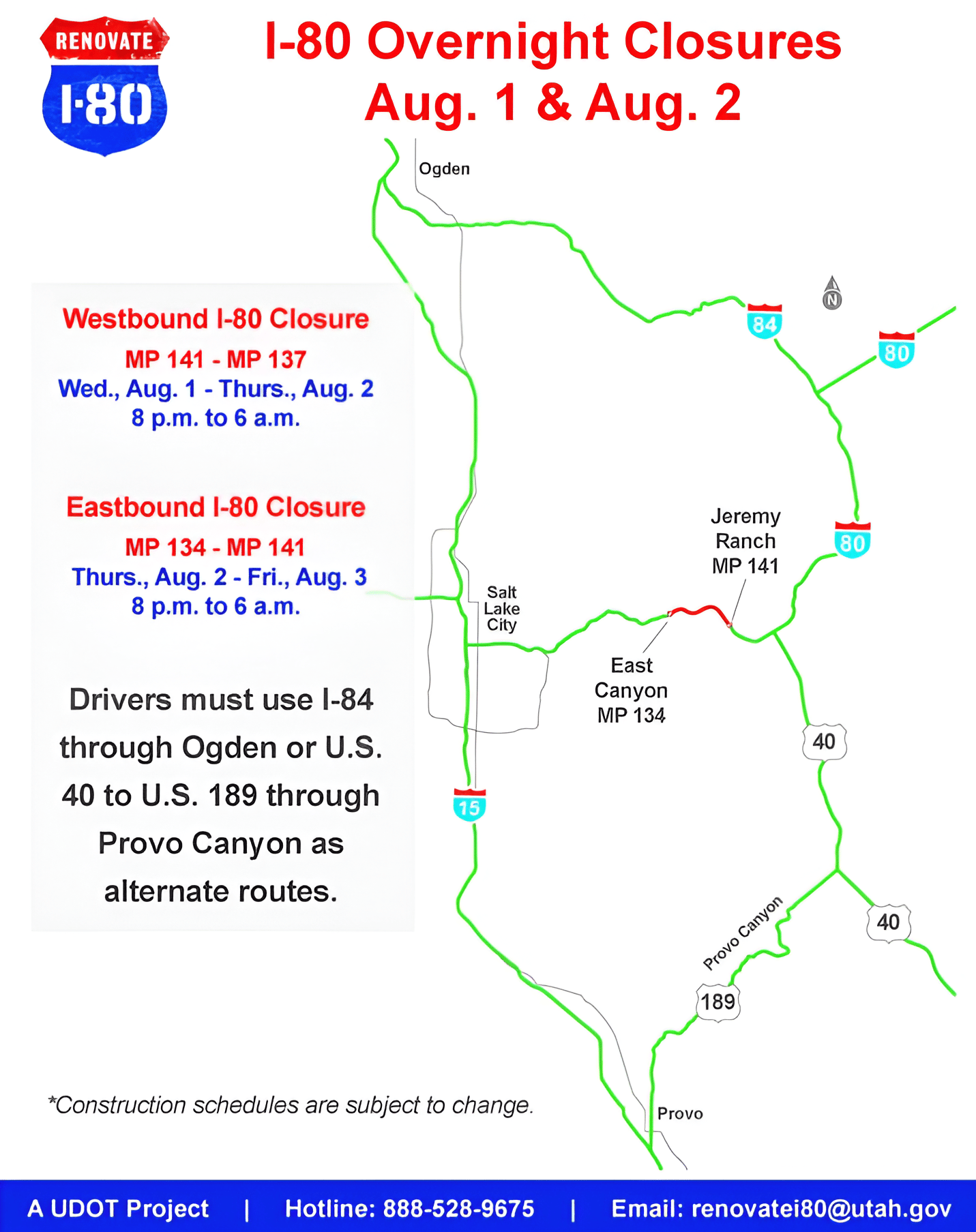 Park City Library is closed all weekend, and, for obvious reasons, no Park Silly Sunday Market will be held. But – please be aware of this huge one – the construction work on I-80 will CONTINUE this evening. This means – I-80 EB will be COMPLETELY CLOSED to all traffic starting at 8 p.m. So if you’re out and about in Park City this evening and need to head back down the canyon to get home – you’ll need to use I-84 through Ogden or U.S. 40 to U.S. 189 through Provo Canyon. So please be aware of timing to avoid any travel headaches!
