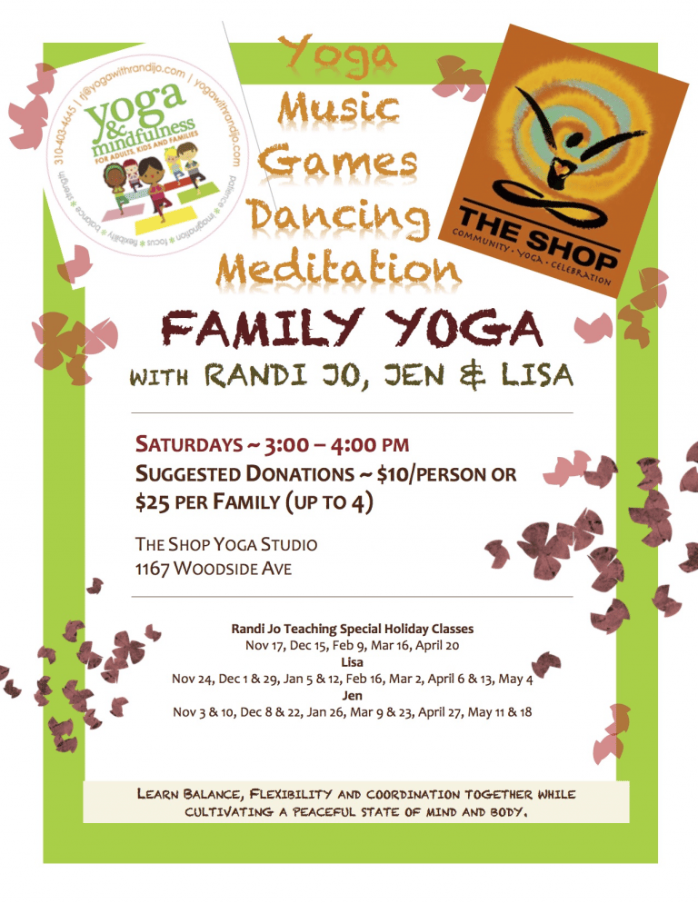 Family yoga with Randi Jo means yoga, mindfulness, music, dancing, storytelling, and journaling. All ages are welcome for this class, each Saturday at The Yoga Shop – no yoga experience is necessary. (This class has a suggested donation of $10 each or $25 for a family of four.)
