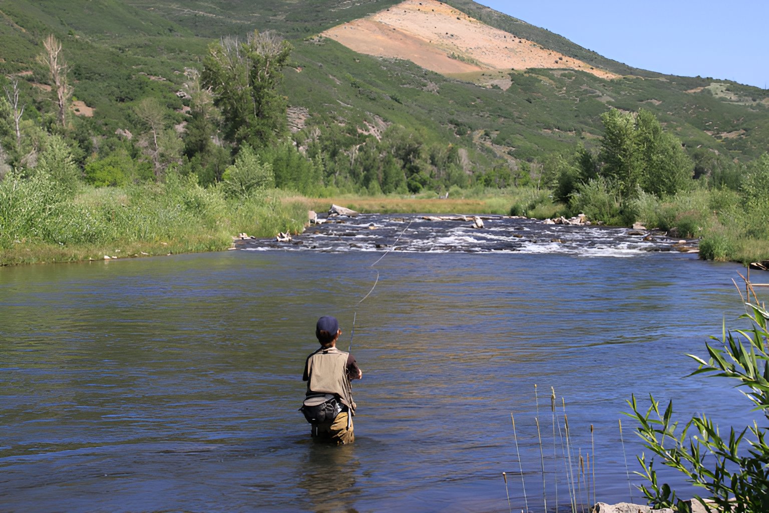 A teenage boy fly fishes in a river outside Park City, Utah.